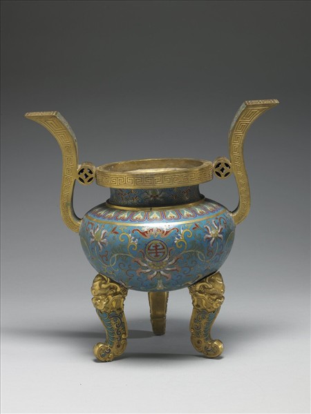 銅胎。寬邊爐口,短直頸,豐肩,斂腹,雙弧形耳,三獸足,仿古銅器鼎的形制。口緣與耳側皆鏨有回紋為飾。器表淺藍地,以掐絲技法製作花紋,頸部飾番蓮紋,肩部飾一周蓮瓣,腹面飾纏枝番蓮、「壽」字、和蝙蝠紋。香爐為五供之一。