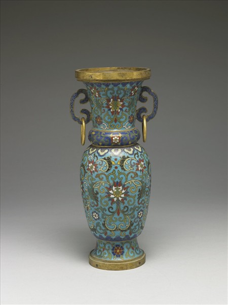 銅胎。侈口立沿,縮腰式頸,豐肩,頸肩間凸棱,斂腹,高撇圈足,雙雲耳帶活環。器表淺藍地,以掐絲技法製作花紋,全器主要以纏枝番蓮與花卉紋為飾。附銅膽。瓶為五供之一。