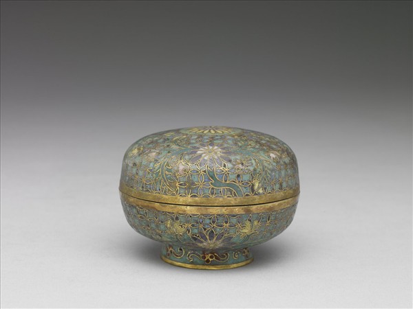 子母口,深壁,圈足,子母口蓋。全器藍綠地,以掐絲技法於器身飾四瓣花紋錦地,腹飾菊花紋,足飾海棠紋。