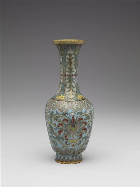 微撇口,長直頸,斜肩,斂腹,撇圈足。頸部綠地,腹與足為藍地。以掐絲技法於頸飾菊花紋與蕉葉紋。肩與腹底飾蓮瓣紋,腹面飾轉枝番蓮紋,足飾如意雲紋。