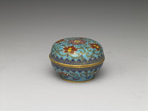 蒸餅式盒,深壁,圈足,子母口蓋。全器藍地,以掐絲技法於蓋緣、口緣飾如意雲紋,蓋飾番蓮紋,足飾幾何紋。