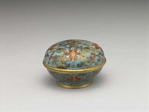 蒸餅式盒,深壁,圈足,子母口蓋。全器淺藍地,以掐絲技法於器表飾轉枝番蓮紋,足飾幾何紋。器底圓形露胎,陰刻「乾隆年製」、「淵」橫向雙行楷款。