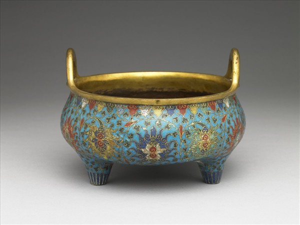 直口,雙立耳,鼓腹,三足。全器藍地,以掐絲技法於口緣飾如意雲紋,器表飾纏枝番蓮紋,足底飾花瓣紋。