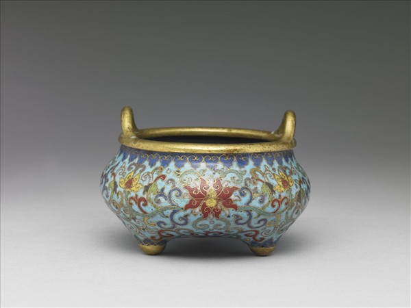 直口,雙立耳,斜肩,鼓腹,三足。全器淺藍地,以掐絲技法於口緣與足底飾如意雲紋,腹飾番蓮紋,底飾六瓣花紋,貼方形金屬片陰刻「乾隆年製」、「淵」橫向雙行楷款。