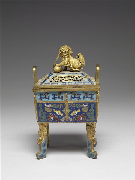 鍍金口,深壁,四角與四面各有稜脊,雙立耳,四足,梯形蓋,獅啣帶戲球鈕。全器藍地,於腹飾夔龍紋與深藍地獸面紋,蓋四開光內飾鏤空蝙蝠紋,開光隙地飾拐子龍紋。
