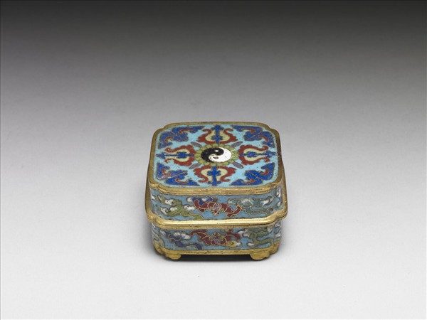 方形子母口,深壁,平底,四足,子母口蓋。全器淺藍地,於蓋頂飾太極圖案,器表飾蝙蝠紋與雲紋。