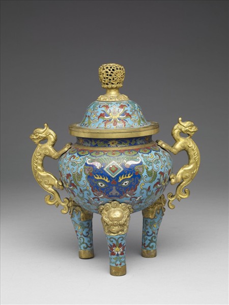 鍍金口,短頸,雙夔龍耳,圓腹,圓底,三張口龍足,穹頂蓋,蓮瓣座鏤空蓮紋鈕。全器淺藍地,以掐絲技法於蓋、足飾番蓮紋,頸飾菊花紋與如意雲紋,腹飾獸面與番蓮紋。中琺503、504、505為一組。