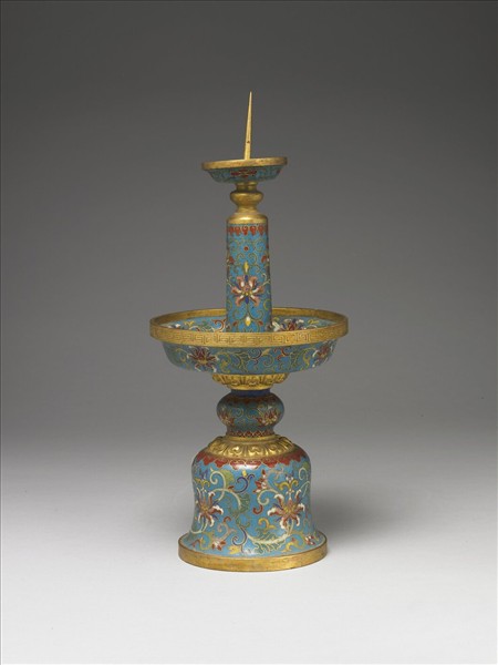 銅胎。以釘形燭阡、支柱、托盤及台座組成。全器以掐絲技法、琺瑯料填色製作花紋,淺藍釉為地,鍍金托盤口沿飾回紋,托盤內施淺藍釉,全器外壁及下托盤內部飾轉枝番蓮紋。