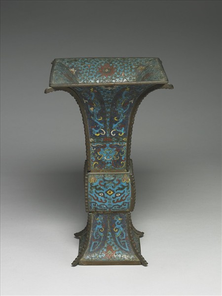 銅胎。方形、撇口、長頸、鼓腹、足部外撇,四邊出戟。以淺藍釉為地,全器主要以掐絲技法、琺瑯料填色製作紋飾,口沿內飾纏枝番蓮紋,頸部及腹部下端飾夔鳳紋、番蓮紋及夔龍紋,鼓腹部飾雲紋組成之變形獸面紋。