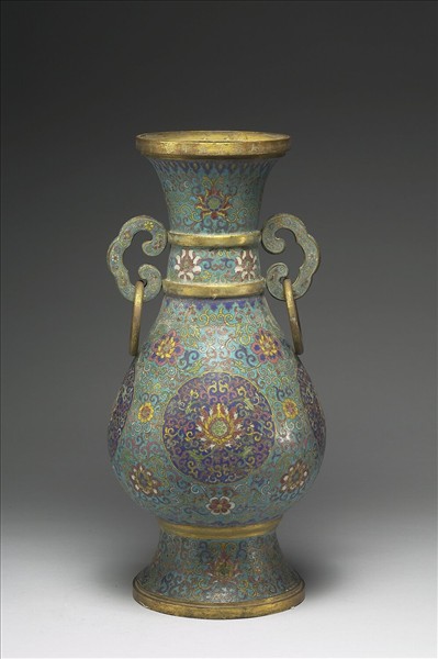 銅胎,掐絲琺瑯。撇口,收腰頸,夸腹,高撇足,肩上有帶活環雲耳一對,器裡與底露胎。全器以掐絲琺瑯技法、琺瑯料填色作裝飾,器身施淺藍色釉為地,滿飾寶相花紋,腹部更有深藍地花形開光四,內亦作寶相花,釉色鮮艷,面多帶小氣孔。鍍金口沿陰刻「大清乾隆年製」楷款。