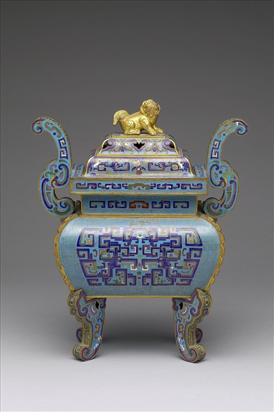 銅胎。長方形,盤口,短頸,斜肩,雙耳,斂腹,四足,帶獅形鈕階形蓋。以掐絲技法製作紋飾,蓋頂有雲紋形鏤孔,全器淺藍地飾金色回紋錦地多彩夔龍紋及拐子龍紋,耳及足部分飾回紋及卷雲紋。香爐為五供之一,本器與中琺687-中琺690成套。