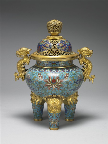 銅胎。圓口,短頸,斜肩,圓腹,鎏金雙螭形耳,獸首三足,帶寶珠形鈕穹頂形子母口蓋、蓋鈕及蓋身飾鏤空番蓮花紋。全器以掐絲技法、琺瑯料填色製作花紋,以淺藍色為地。蓋上如意雲形開光,內以掐絲琺瑯飾番蓮、蝙蝠及壽字,器腹飾蓮花紋、番蓮紋、變形夔龍紋,肩部飾蓮瓣紋,足部頂端飾鎏金張口獸首。鎏金口沿、足下緣飾回紋邊飾。香爐為五供之一,本器與中琺691-中琺694成套。