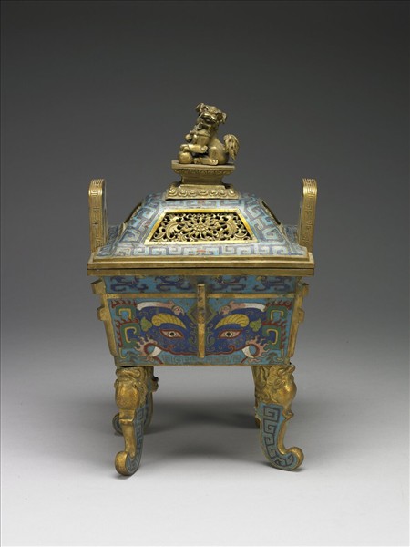 銅胎。全器呈長方形,敞口,鎏金雙立耳,深壁,四邊及四面中心共有八道鎏金出戟,鎏金四螭形足,帶鎏金戲球獅鈕梯形蓋,蓋鈕以一方形蓮瓣紋座與蓋連結,全器以掐絲技法、琺瑯廖填色製作花紋,蓋身飾夔龍形紋,有四梯形開光,內為鏤空番蓮花紋,腹部上端飾鳥紋,腹部及耳飾獸面紋及回紋,底部飾番蓮紋,鎏金足為昂首螭,螭身飾掐絲琺瑯回紋。香爐為五供之一,本器與中琺546-中琺549成套。