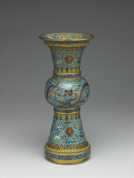 撇口,長頸,鼓腹下端外撇,平底,圈足。全器為淺藍地掐絲琺瑯,口沿內飾番蓮紋,口沿外飾卷草紋,下接鑄刻連珠紋,頸部及腹部下段飾如意雲紋、番蓮紋及蕉葉紋,鼓腹飾行龍紋及火珠紋。底部露胎,有陰刻「乾隆年製」四字雙行楷書雙方框款。
