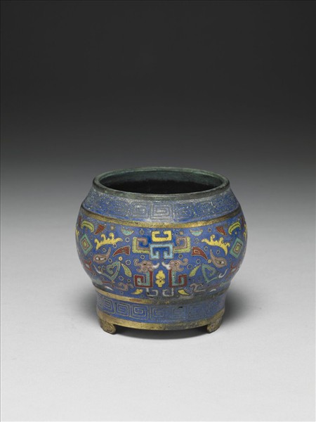 直口,鼓腹,圈足下接三雲紋足座。全器為藍地掐絲琺瑯,口沿及圈足飾回紋,腹飾三組獸面紋及三對夔龍紋,底飾葵花紋。底部方形露胎,有陰刻「乾隆年製」橫向四字單行楷款及一「必」字。