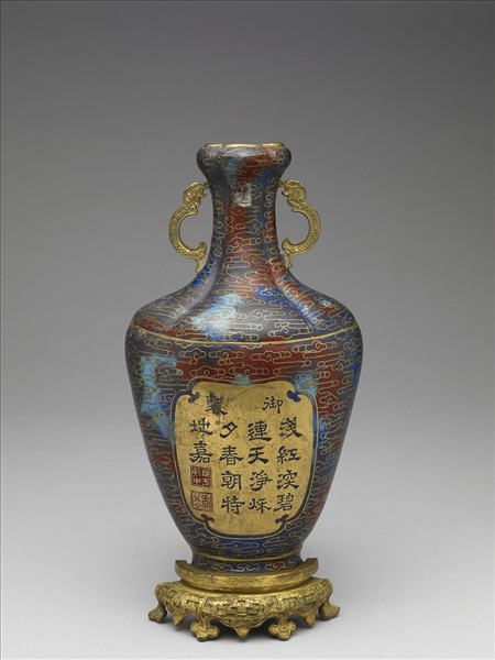 銅胎,前面為蒜頭口長頸豐肩斂腹瓶,雙螭耳,連接浮雕式拐子龍紋如意雲足座,靠牆面平,頸下方有一孔可以直接掛在牆面的釘上,故稱壁瓶,清檔中稱之轎瓶。此型器始見於明萬曆朝,清代盛行於乾隆時期。此瓶為紅、藍、紫地成不規則塊面分佈,全器作朵雲紋錦地,腹部開光鍍金地填御製「御製」二字及詩文「淺紅湥碧連天淨,秋夕春朝特地嘉。」落「臣于敏中」紅地陰文印、「以寫葵心」鍍金地陽文填紅字。于敏中(1714-1781),乾隆二年(1737)中狀元,工書法,歷官文華殿大學士,二十五年(1760)入懋勤殿奉敕寫華嚴經寶塔,廷論多出其手。