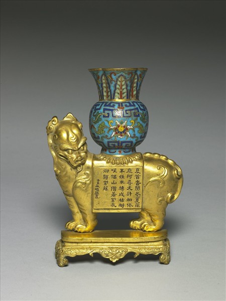 銅胎,雕鎏金異獸回首端立於四如意足座上,獸背有披飾,上刻乾隆皇帝第八子永璇(1746-1832)之隸字題詩。背上並馱有一掐絲琺瑯瓶,瓶口應為四瓣花形,瓶上掐絲藍地蕉葉、番蓮紋為飾。靠牆面平,面上有一孔可以直接掛在牆面的釘上,故稱壁瓶,清檔中稱之轎瓶。