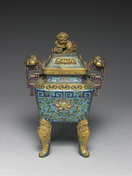 四方形,直口,短頸,折肩,雙耳,斂腹,四足,帶獅戲球鈕梯形蓋一只。以掐絲為飾,全器淺藍地,蓋四面開光,內飾鏤空番蓮紋,開光隙地飾回紋,口沿為鑄刻回紋,肩部飾如意雲紋,頸部及腹部上緣飾回紋,器腹飾番蓮紋,底飾六瓣花紋,耳上如意雲紋形座中飾蝙蝠,足為鑄刻仰首魚龍紋。中琺581~583為一組。