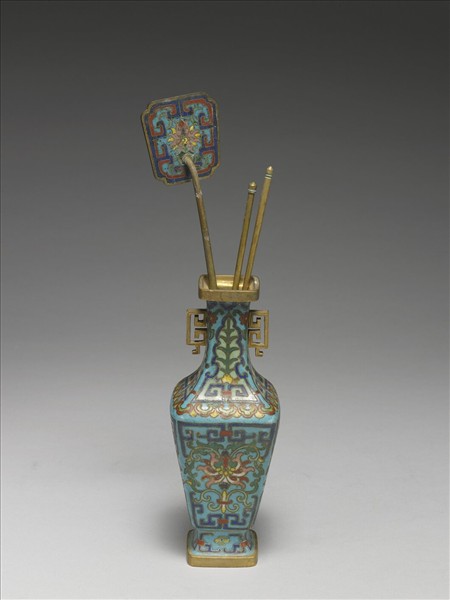 四方形,直口,折沿,長頸,雙回紋耳,斜肩,斂腹,外撇圈足。頸飾如意雲紋、蕉葉紋及回紋,腹飾回紋及番蓮紋,圈足飾回紋及海棠紋。附番蓮紋銅鏟一只及銅箸一雙。中琺581~583為一組。