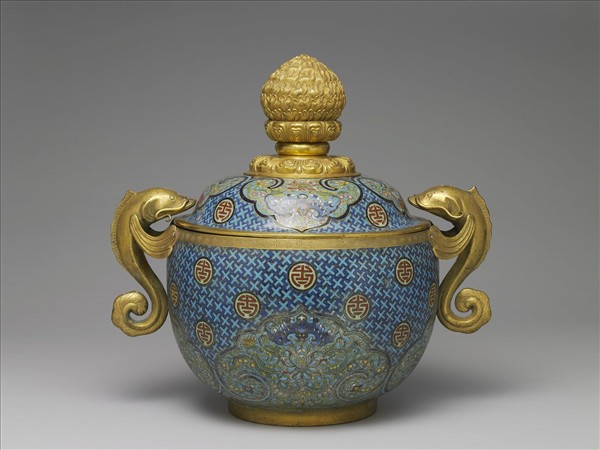 斂口,深壁,圈足,雙鯰型耳,帶蓮瓣座蓮苞鈕圓頂蓋一。器表飾十字紋錦地,蓋緣及器腹四邊有如意雲形開光,內飾紅、藍蝙蝠紋及番蓮紋,開光隙地飾圓形淺綠底紅色團壽字,鯰魚嘴中心有一孔。底有鑄刻去地陽文「景泰年製」四字雙行楷書方框款。