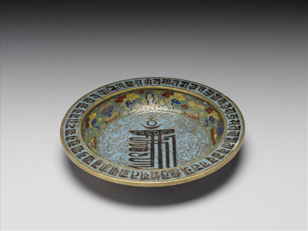 侈口,折沿,淺壁,平底,圈足。口沿及內底為淺藍地,口沿寫有一圈梵文,內底有卷鬚錦,中心有一由七個梵文及三個符號組成的「十相自在」吉祥紋飾,其餘為淺綠地,盤內外壁為朵雲紋間飾佛教七珍、八寶。底部有陰刻「乾隆年製」四字雙行楷書雙方框款。