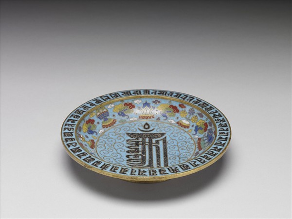 侈口,折沿,淺壁,平底,圈足。口沿及內底為淺藍地,口沿寫有一圈梵文,內底有卷鬚錦,中心有一由七個梵文及三個符號組成的「十相自在」吉祥紋飾,其餘為淺綠地,盤內外壁為朵雲紋間飾佛教七珍、八寶。底部有陰刻「乾隆年製」四字雙行楷書雙方框款。