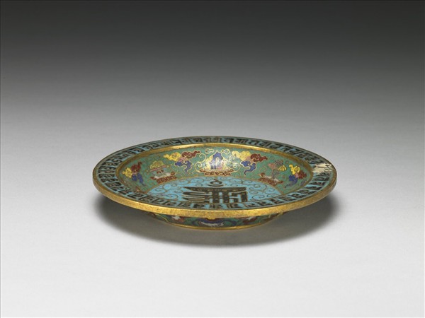 侈口,折沿,淺壁,平底,圈足。口沿及內底為淺藍地,口沿寫有一圈梵文,內底有卷鬚錦,中心有一由七個梵文及三個符號組成的「十相自在」吉祥紋飾,其餘為淺綠地,盤內外壁為朵雲紋間飾佛教七珍、八寶。底部有陰刻「乾隆年製」四字雙行楷書雙方框款。中琺592~596為一組。
