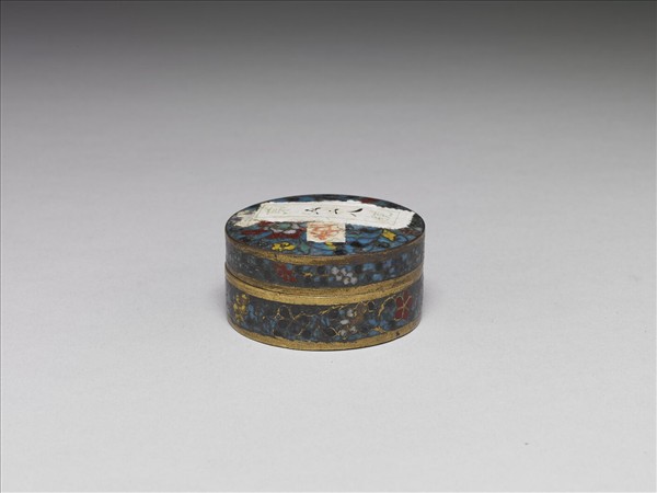 子母口,直壁,平底,帶平頂子母口蓋一只。器表藍地飾掐絲朵花紋。