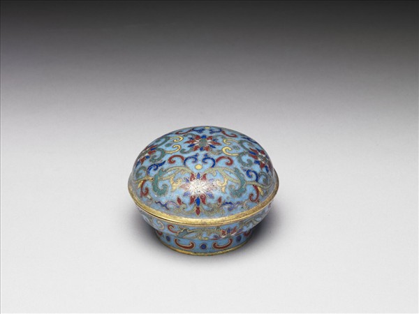 子母口,深壁,圈足,帶一子母口圓頂蓋。器表淺藍地,蓋及外壁飾番蓮紋,圈足飾幾何紋。底部陰刻「乾隆年製」橫向四字單行楷款及一「謹」字。中琺603~605為一組。
