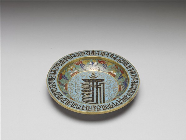 銅胎,折沿,淺壁,平底,圈足。折沿及盤心為淺藍地,折沿飾掐絲梵文一圈,盤心佈卷鬚錦,中心有一由七個梵文及三個符號組成的「十相自在」吉祥紋飾。其餘為淺綠地,盤內外壁分別繪朵雲紋間飾佛教七珍、八寶。底部陰刻「乾隆年製」四字雙行楷書雙方框款。