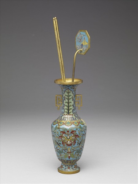 銅胎,侈口立沿,長束頸,削肩,斂腹,雙耳,圈足外撇。器表淺藍地,以掐絲技法製作花紋,頸蕉葉,肩如意雲頭紋,腹外壁大朵纏枝番蓮花葉紋,近足處蓮瓣紋一圈。附銅箸一雙、香鏟一支。本器與他件爐、盒共成「爐瓶盒一組」。