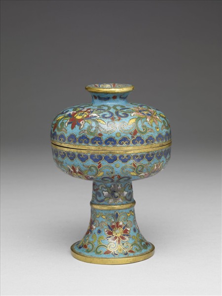 銅胎,器仿古祭祀器豆之形制。蓋與腹合組成圓盒狀,蓋頂有唇口圓盤式鈕,高撇圈足。器棱鍍金,器表淺藍地,以掐絲技法製作花紋,除蓋沿和口緣飾藍色如意雲紋外,以纏枝番蓮花葉為飾。足上鍍金凸棱一圈,將足壁分隔為上下兩部分,亦飾以番蓮花葉。本器與他件爐、瓶共成「爐瓶盒 一組」。