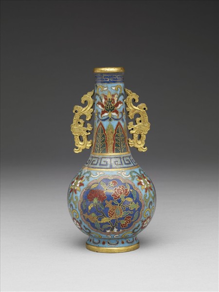 直口,長頸,斜肩,圓腹,雙螭形耳,撇足。全器淺藍地,以掐絲技法於口緣與肩部飾深藍地回紋,頸飾番蓮紋與蕉葉紋,腹部四開光內深藍地,飾各種花卉與飛禽。開光隙地飾折枝番蓮紋與五瓣花紋,足部飾幾何紋。
