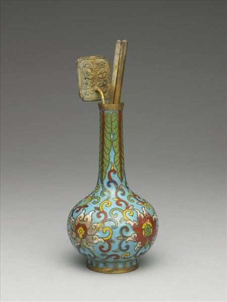 直口,長頸,斜肩,圓腹,圈足。全器淺藍地,以掐絲技法於頸部飾蕉葉紋,腹部飾番蓮紋,足飾幾何紋。附方形銅鏟一,銅箸一雙。