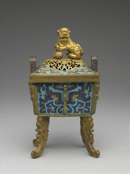 長方形,直口,方腹,平底,雙立耳,四足,四角與四面各有棱脊。鏤空花紋梯形蓋,獅戲球鈕。全器淺藍地,以掐絲技法於蓋面飾花卉紋,腹部為獸面紋。