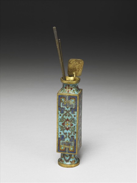 圓口,短頸,平肩,長方腹,撇高圈足。全器淺藍地,以掐絲技法於頸、腹部飾四瓣花紋,腹上下各飾拐子龍紋,足飾蕉葉與朵花紋,有鏟箸。