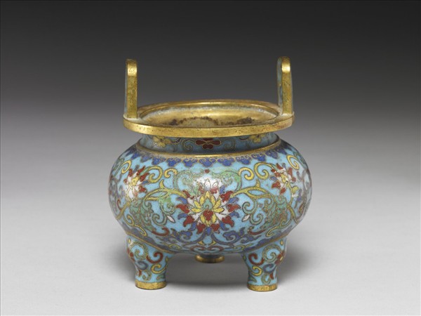 鍍金口,短頸,圓腹,雙立耳,三足,全器淺藍地,以掐絲技法於頸飾海棠紋,腹飾轉枝番蓮紋,足飾葵花紋,腹與足頂各飾一圈如意雲紋,腹底飾六瓣花紋。底部圓形露胎陰刻「乾隆年製」橫向四字單行楷款及一「更」字。