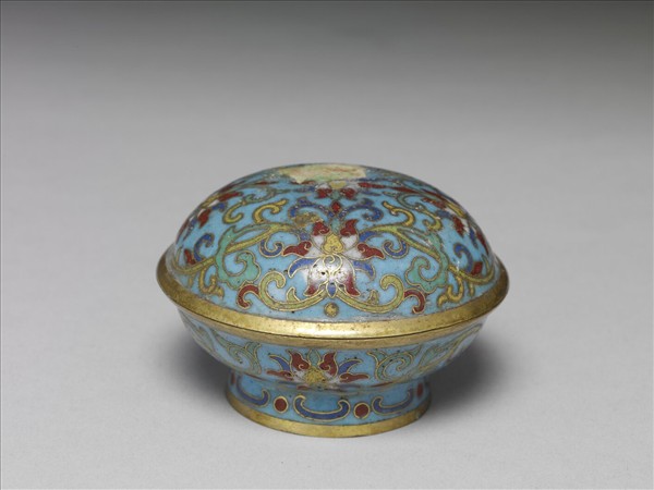 子母口,圓盒,深壁,圈足,子母口蓋。全器淺藍地,以掐絲技法於蓋與腹飾轉枝番蓮紋,圈足飾幾何紋,底部圓形露胎陰刻「乾隆年製」橫向四字單行楷款及一「更」字。