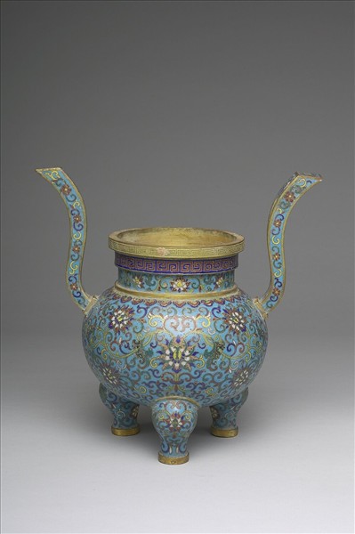 銅胎。直口,短頸,雙板形耳,短頸,圓腹,圓底,三足。全器以掐絲技法、琺瑯料填色製作花紋,以淺藍色為地,口沿飾回紋,雙耳飾葵花紋,頸部、腹部及足飾纏枝番蓮紋。底有陰刻「乾隆年製」雙行楷書雙方框款。香爐為五供之一,本器與中琺657-662成套。