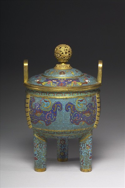銅胎,侈口,碩腹,圓底,雙立耳,三柱足,帶雕龍圓鈕蓋。蓋面掐絲藍色獸面紋,餘則滿飾淺藍地掐絲回紋。腹外壁掐絲藍色獸面紋為主要紋飾,餘亦滿飾淺藍地掐絲回紋,上下各掐絲簡化如意雲頭紋一圈,另腹壁並有棱脊兩道,上鏨回紋。柱足飾淺藍地獸面紋與回紋。底外掐絲藍圈「乾隆年製」雙行四字楷款。