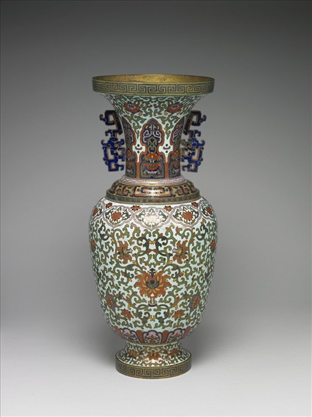 銅胎。撇口,長頸,雙螭形耳,階式肩,斂腹,圈足外撇。以掐絲琺瑯為飾,全器淺藍地,口沿及圈足緣飾回紋,頸部有茶花紋及蕉葉形開光,內飾蓮紋及夔龍紋,肩部飾夔龍紋,腹部上緣有如意雲形開光,內飾番蓮紋,下緣飾蓮瓣紋,中間為纏枝番蓮紋,圈足亦飾番蓮紋。與中琺677成對。