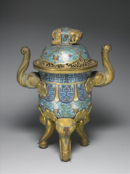 銅胎。口微敞,直長腹,鎏金雙象首形耳,圓底,鎏金三象鼻形足,帶象形鈕穹頂形子母蓋口。以掐絲技法、琺瑯料填色製作花紋,全器淺藍地,蓋鈕之象採回首跪姿,被披一藍地番蓮花鞍巾,周圍飾拐子龍紋,下接如意形開光,內飾番蓮紋,蓋沿飾鎏金鏤空祥雲蝙蝠紋;器身口緣飾回紋,腹部上端飾一圈夔龍紋,中段為半圓形開光,內飾雙夔龍紋,下端為番蓮花紋,底部為一葵花紋。耳及足之象首部分飾有藍地紅花轡。