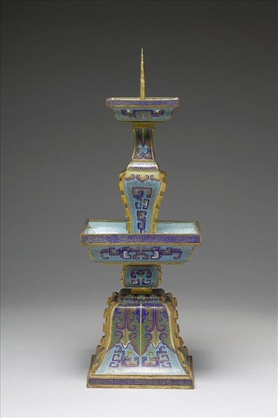 銅胎。全器呈正方形,由釘形燭阡、托盤、支柱及台座組成,支柱及台座四邊有出戟。以掐絲技法、琺瑯料填色製作花紋,以淺藍釉為地,托盤內壁光素無紋,口沿外為回紋,外壁飾回紋錦地夔龍紋,中段支柱及底座飾蕉葉紋、獸面紋、蓮瓣紋、如意雲紋及回紋錦地夔龍紋。燭臺為五供之一,本器與中琺686、中琺688-中琺690及中琺543成套。