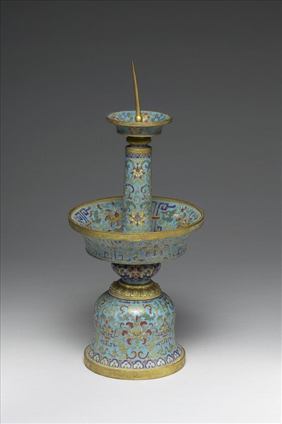 銅胎。由釘形燭阡、托盤、支柱及台座組成。以掐絲技法、琺瑯料填色製作花紋,以淺藍釉為地,上托盤及中段支柱飾番蓮紋及如意雲紋,下托盤及底座飾蓮瓣紋、如意雲紋及夔龍紋,台座上端鏨飾鎏金蓮瓣紋,鎏金托盤口沿及台座下緣鏨飾回紋。燭臺為五供之一,本器與中琺692-中琺694及中琺544成套。