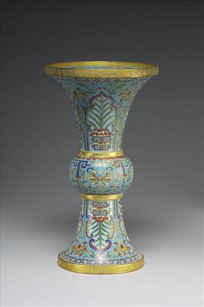 銅胎。撇口,長頸,鼓腹,下端外撇。用掐絲技法、琺瑯料填色製作花紋,以淺藍釉為地,頸部及腹部下端飾蕉葉紋,開光內飾蓮花紋及拐子龍紋,隙地飾番蓮紋,邊緣飾回紋及如意雲紋,腹部飾番蓮花紋、拐子龍紋及如意雲紋。鎏金口沿、鼓腹部上下端及足沿鏨飾回紋。內附一銅膽。瓶為五供之一,本器與中琺691-中琺694及中琺544成套。