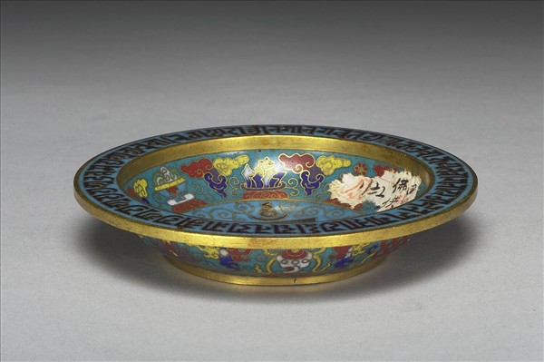 銅胎,折沿,盤心略凹。盤內外施藍釉地,折沿面飾梵文,背為五彩祥雲,內外盤壁於祥雲間分別飾佛教七珍、八寶,盤心卷鬚錦中央飾由七個梵文和三個符號組合成的「十相自在」吉祥紋飾。底鍍金陰刻「乾隆年製」雙方框楷書款。