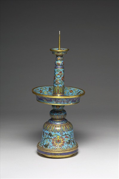 銅胎。由燭阡,支柱,托盤及台座組成。下托盤內壁掐絲淺藍地轉枝花卉,外壁拐子龍紋。台座上端蕉葉紋,餘以藍地番蓮紋為飾。燭台為五供之一,本器與他件燭台、香爐、花瓶同成五供。