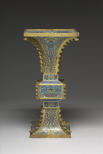 銅胎。正方形,撇口,長頸,鼓腹下段外撇,矮圈足,四邊出戟。器身以淺藍色為地,以掐絲技法製作花紋,口沿內飾拐子龍紋及番蓮紋,頸部及腹部下端飾蕉葉紋及番蓮紋,鼓腹飾獸面紋及拐子龍紋,口沿及足緣飾回紋。瓶為五供之一,本器與中琺721~725成套。