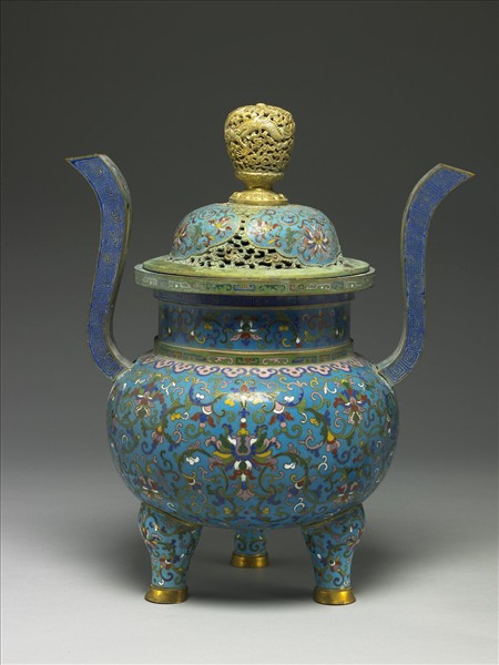 銅胎。子母口,折邊,短頸,圓腹,雙板形耳,三足,帶寶珠形鈕穹頂形子母口蓋。蓋鈕飾鏤空雲龍紋,蓋身飾鏤空祥雲紋及如意雲形開光,內以掐絲琺瑯飾番蓮紋,器身以淺藍色為地,頸部飾轉枝番蓮紋,肩部飾變形夔龍紋及如意雲紋,腹部及足飾纏枝番蓮紋,底飾葵花紋。香爐為五供之一,本器與中琺727~730成套。