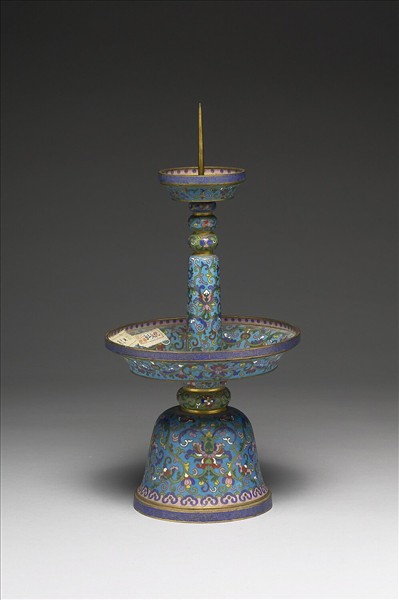 銅胎。由釘形燭阡,支柱,托盤及台座組成。器身以淺藍色為地,以掐絲技法製作花紋,全器飾纏枝番蓮紋,托盤口緣及台座下緣外側飾回紋,台座下端飾如意雲紋邊飾。燭台為五供之一,本器與中琺726~730成套。